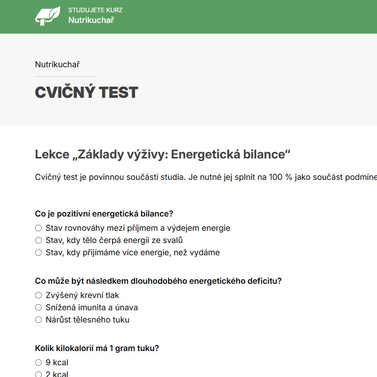 Nastudovať teóriu z lekcie a napísať cvičný test je investíciou 20-30 minút. Ak je súčasťou príslušnej lekcie aj práca s výučbovou aplikáciou prípadne príprava receptu v kuchyni, počítajte s ďalším časom navyše.