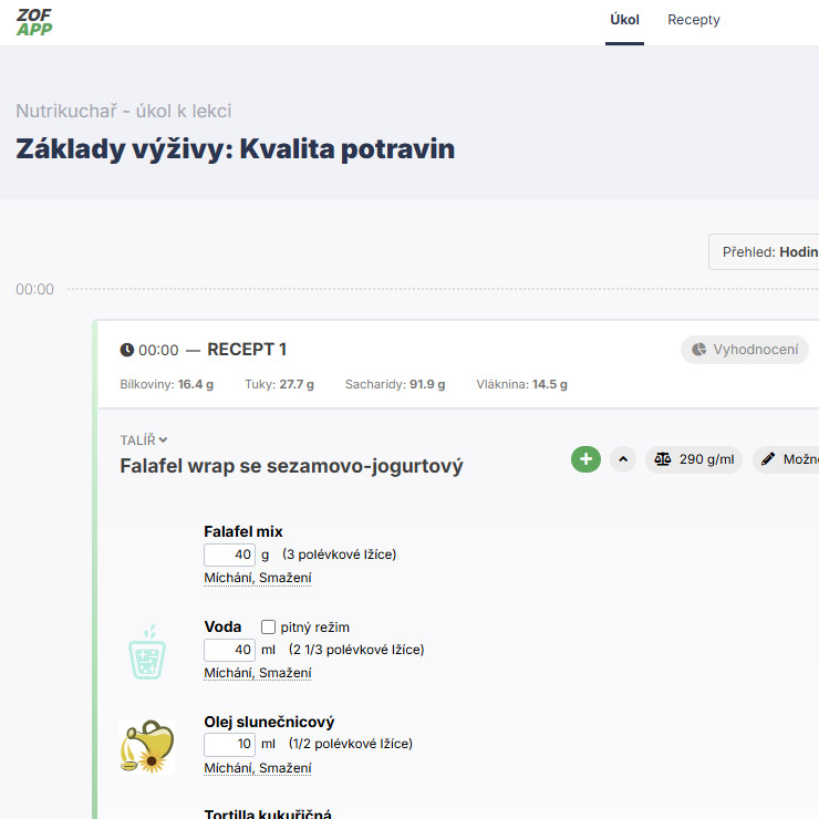 Na výučbovej aplikácii ZOF sa učíte pracovať s receptami formou kreatívnych úprav ich zloženia a nutričného hodnotenia. Vybrané recepty potom v rámci „domácich úloh“ pripravujete vo vlastnej kuchyni.