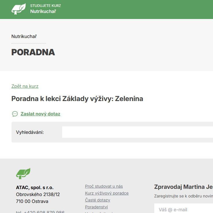 Máte prístup k on-line poradni, v ktorej lektor priebežne odpovedá na všetky otázky týkajúce sa aktuálne preberaných tém. K dispozícii je celá história Poradne, táto slúži ako zdroj ďalšieho študijného materiálu.